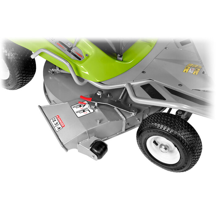 La regolazione dell’altezza di taglio va’ da 2,5 a 8cm e si effettua tramite una leva a 6 posizioni, la stessa leva dispone di un’ulteriore posizione per il trasferimento che consente di sollevare maggiormente l’intero apparato di taglio da terra, interrompendo automaticamente la rotazione delle lame per superare agevolmente cordoli ed ostacoli.